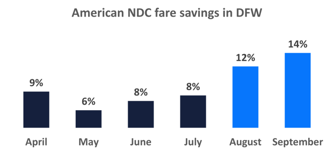 So that 54% August data above means that on 54% of AmTrav bookings including American in or out of Dallas booked in August, American supplied a lower fare via their NDC direct connection than they supplied via the non-NDC GDS connection (that Concur Travel, Deem and Egencia use).