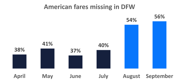 Through July, American averaged 37% of fares missing from those corporate bookings tools, including 39% of fares in DFW, American’s home and largest market.