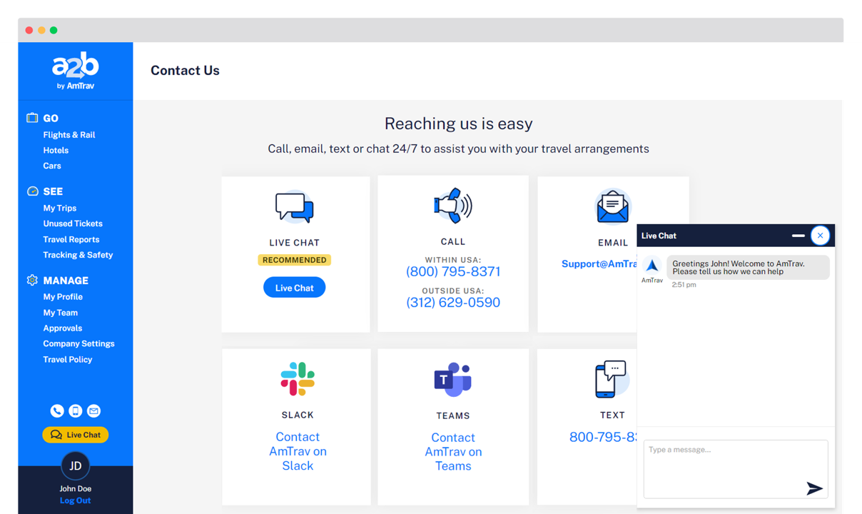 Need to change a flight, check on a hotel booking or get a fast answer on a booking? Now you and your team can reach Travel Advisors via your Microsoft Teams and Slack accounts, no need to open a new browser window (though you can still chat Travel Advisors on AmTrav.com, the a2b booking tool and the AmTrav app).