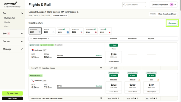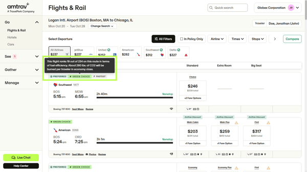 AmTrav offers two tools that help you track your company’s carbon dioxide emissions and allow your bookers to compare the emissions between different flight and rail options: