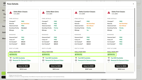 Want to compare different flights? The third way is to use the Compare feature, selecting different cabins on different flights, then scrolling down in the Compare Fare window to see the emissions for each flight and fare or cabin: