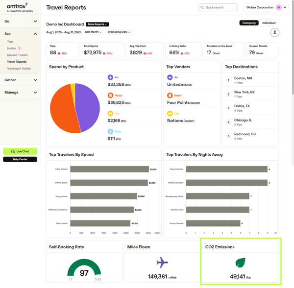 Detailed CO2 reporting: Need to track your company’s CO2 emissions? It’s easy to see your CO2 emissions from air and rail travel in AmTrav’s new CO2 Report, your Air Spend Report, and at-a-glance in your Company Dashboard. Historical data is available dating back at least six years. You and your travelers can also see your individual impact and miles traveled in your individual Dashboard.