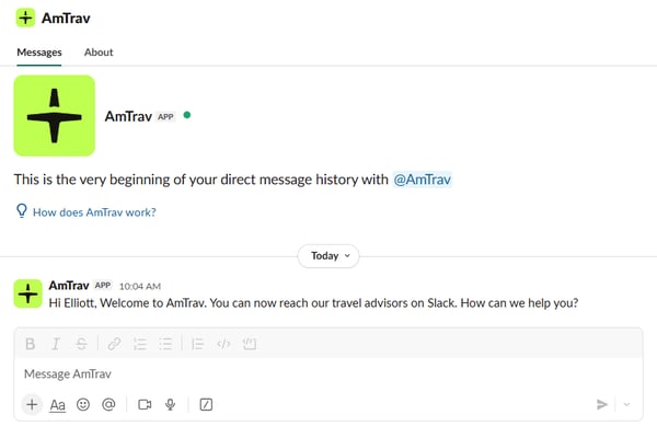 We love your AmTrav Relationship Manager too! You can reach AmTrav Travel Advisors via the AmTrav Slack app, you'd need an external connection to chat with your AmTrav Relationship Managers via Slack (with their agreement).