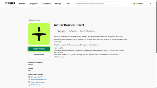 Step 1: Add an app to your Slack app by either navigating to the AmTrav Slack page and clicking either "Add to Slack" or "Open in Slack" on the lefthand side of the page. Note: you need to be signed into Slack under the same email address that you have registered with AmTrav (likely your work email address), once you add the Slack app to your account, AmTrav will recognize you by your email address.