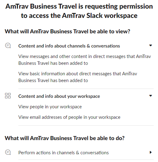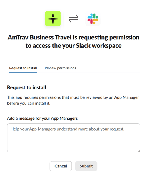Step 2b: If you see "Add to Slack" you'll be prompted to either "Allow" the AmTrav app to connect to your Slack workspace (along with a disclosure about what the AmTrav app can do -- more about that in the FAQ), or you'll be prompted to send a message to your Slack workspace admins requesting that they add the AmTrav Slack app to your workspace. If you're prompted to send them a request, do it!