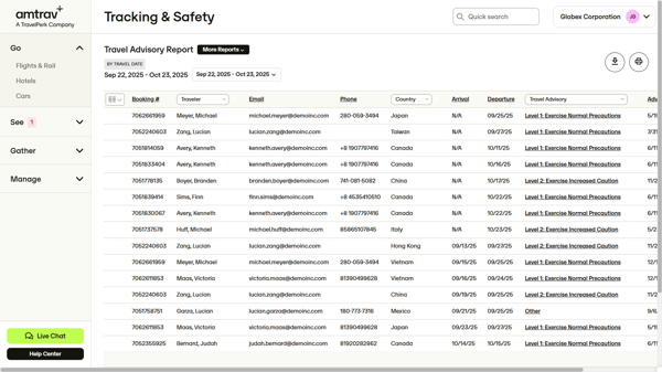 The Travel Advisories report shows AmTrav Admins and Bookers what Travel Advisories affect current and future booked trips, Travel Advisories are not available in AmTrav’s shopping and booking section.