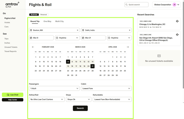 Step 2: Search for the itinerary you'll likely take, for example Boston-Delhi here, then click Search: