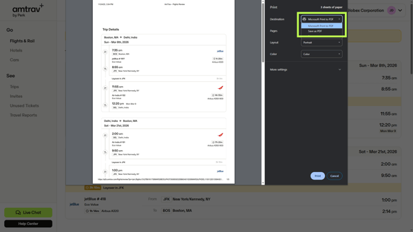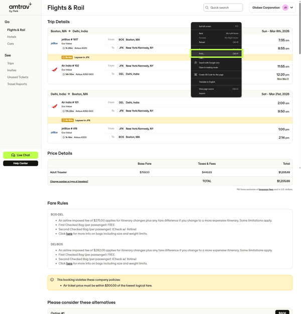 Step 4: You've landed on the Trip Details page, it's time to record the itinerary! You need to print this page, so right click and select "Print" or click CTRL+P (PC) or Shift+Command+3 (Mac). Note that this page includes your pricing and fare rules.