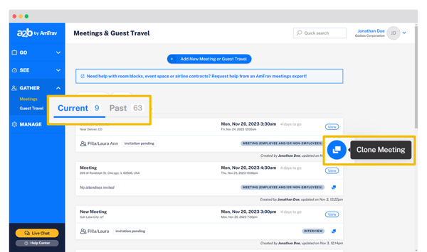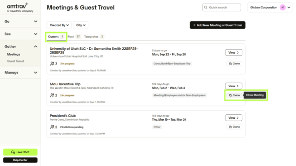 Clone: Cloning an current or past meeting is really easy, just find a current or past meeting in your Gather page, then click the Clone button in the lower righthand corner of the meeting: