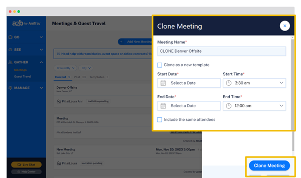 From there you can set the new meeting's name, dates and times (the location will carry over from the original meeting), decide whether to include the same attendees from the initial meeting, and click Clone Meeting to create the new meeting.