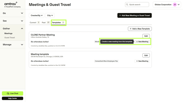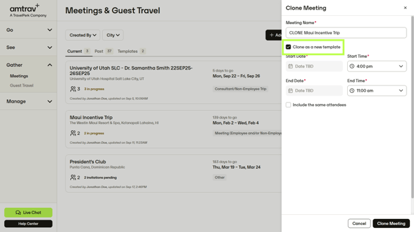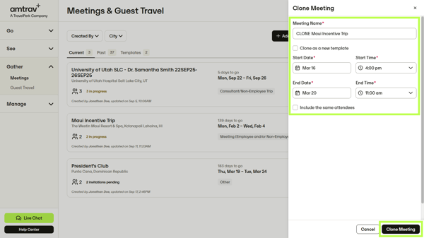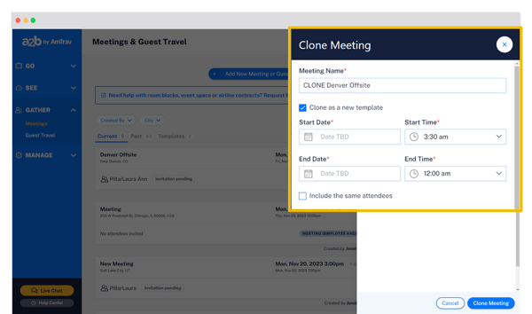 Note that cloning and templates carry over your meeting start and end times (but not dates), flight, hotel, car rental, approver and optional billing fields. When cloning you can decide whether to include the same attendees. And you can revise any of these in your new meeting.
