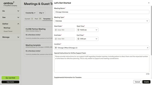 From there you can add meeting details for the template including the template meeting name, type, start time and end time (the date will be set when you clone the template), location and any notes. Once you click Create to create the template, you can set flight, hotel, car rental, approver and optional billing fields for the template.