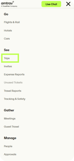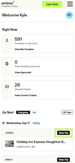 Step 1: Select the trip with the hotel that you're checking in to from your AmTrav homepage (click View Trips) or select Trips from the menu. If you navigated to Trips, select the trip with the hotel that you're checking in to by clicking View Trip.