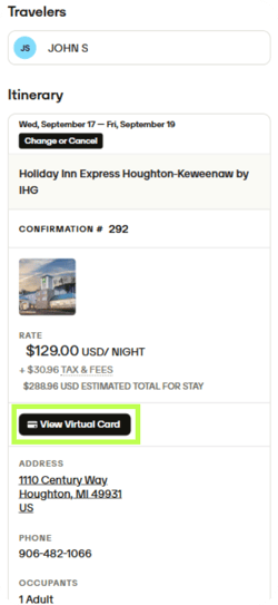 Step 2: On the Trip Details page, scroll down to the hotel booking and click View Virtual Card: