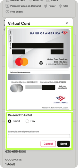 Step 3: Finally, you'll see an image of the one-time use virtual card including the card number, expiration date and CVV, you can either present that card. Or you can send it to the hotel front desk via an email or fax number that they provide and you input, then click Send: