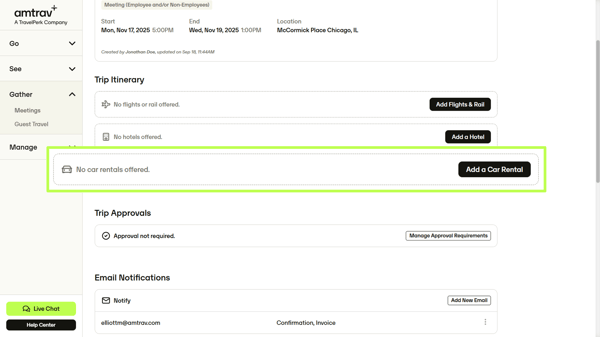 Add a Car Rental: Set the parameters, policies and payments for any car rentals for your guests, note that the car rental search will be centered on the Meeting Location you specified in the meeting setup: