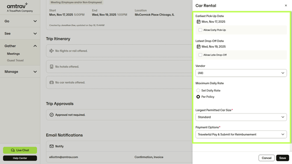 - Select the Payment Options you'd like your guests to use for their car rental: 1. traveler responsible for payment or 2. traveler pay with their own card then request reimbursement directly with you. Because car rentals can be reserved without putting down a card and car rentals cannot be paid through AmTrav, AmTrav only offers these two options.