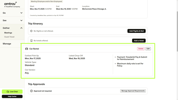 In your main meeting menu you'll see a summary of the car rental policies and parameters in the Meeting and you can click Edit to change the car rental settings (or remove the car rental) at any time from the Meeting.