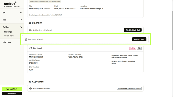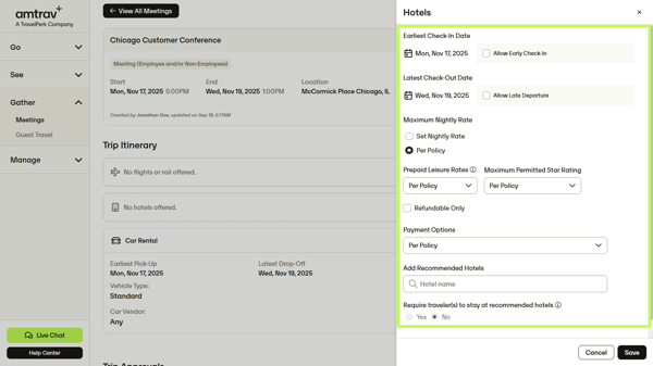 - If there are specific hotels you'd recommend or require your travelers to stay at then specify those in Add Recommended Hotels, searching for and selecting the specific hotel (note: one property near your meeting, you can't select an entire chain) then checking Yes if you require travelers to stay at recommended hotels. (Remember that Gather pulls in any negotiated hotel rates that your company has stored in AmTrav, this is a great way to guide travelers to those hotels and rates.) Recommended hotels will be flagged as preferred for your guests, if you check Require then non-recommended hotels will be flagged as out of policy for your guests.