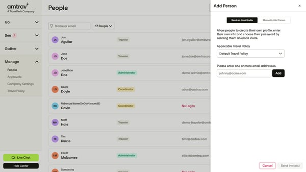 Step 1: Click on People on the left side of the AmTrav page. On the upper right side of the page, click on Add Person. Note that you can view (and edit), delete, view trips and invites for each user by clicking on the vertical ... here too: