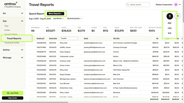 You can download any report from your dashboard. Once you log in, click on Travel Reports and your Account Dashboard will be displayed, you can hover over More Reports to see more of AmTrav's 20+ reports.