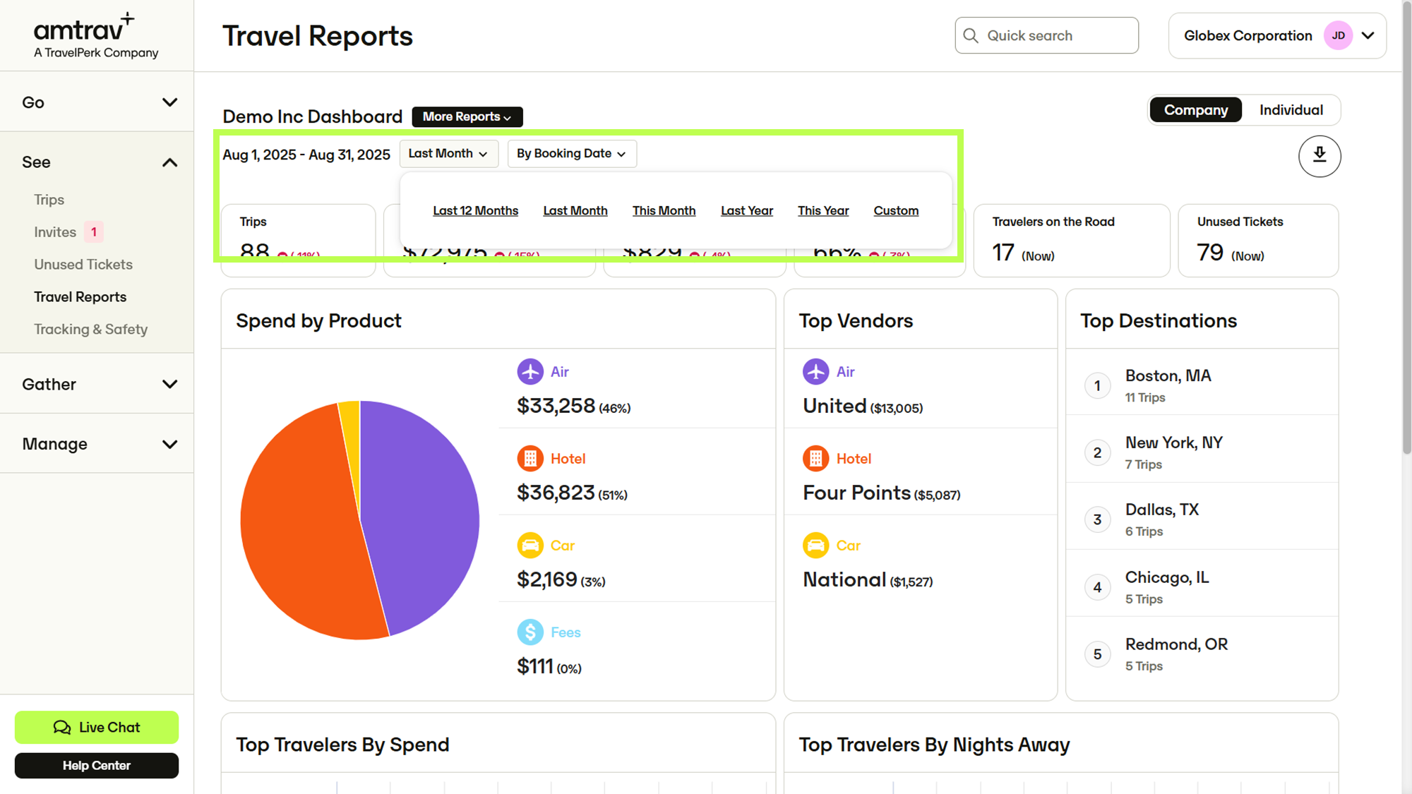 At the top of the dashboard you can select a set or custom date range and display data By Booking Date or Travel Date (Booking Date is when your booker made the booking, Travel Date is when your traveler departed).