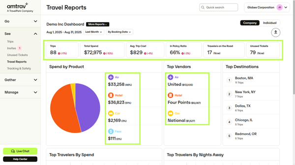 Quick tip: many of the numbers and fields on the Dashboard click through to reports. Click on Total Spent to see your Spend Report, click on In Policy Ratio to see the Policy Compliance Report, Travelers on the Road to see the Traveler Locator, or any of the Air, Hotel and Car Product and Vendor fields to see those product Spend Reports.