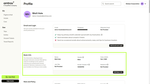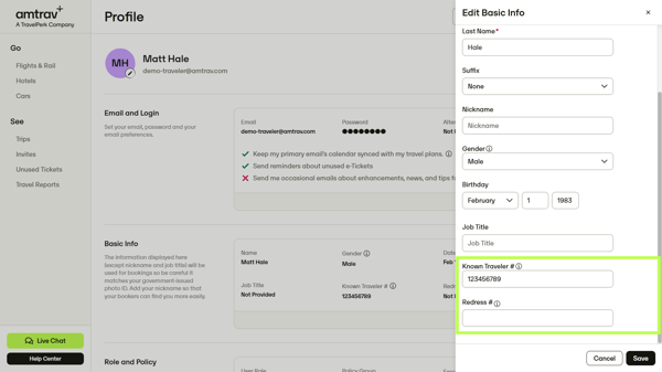 Step 3: In the Basic Info box, enter your Known Traveler # in the field provided (see below). You can also add your Redress # in this area if you have one. Click Save. This information will now automatically be applied to all future airline bookings through AmTrav, online and booked with Travel Advisors.