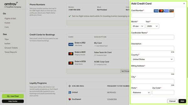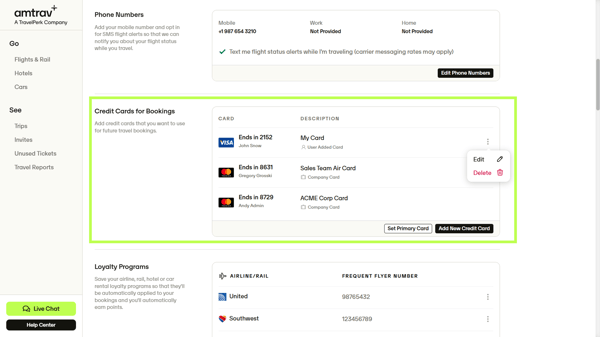 Step 2: Scroll down to the Credit Cards for Bookings section and click Add New Credit Card. If you're updating or removing a card click the vertical ... on the right, click Edit or Delete. (You can only change your own cards, cannot change company cards -- those are controlled by Administrators in Company Settings.)