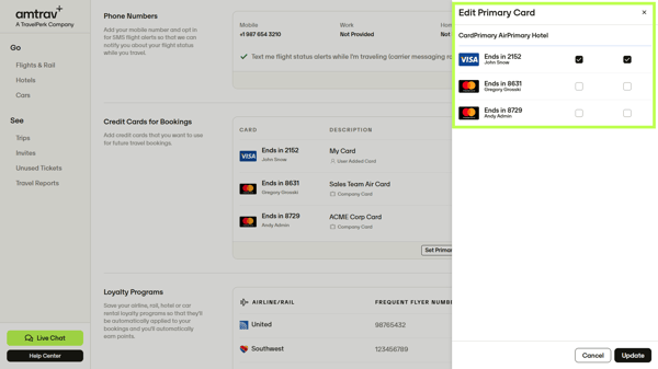 Step 4: Once your card is added, you can designate it as your primary (aka default) card by clicking Set Primary Card and designating which card you'd like set as default for your air and hotel purchases using the corresponding checkboxes (you may only specify one for air and one for hotel), click Update to commit the changes: