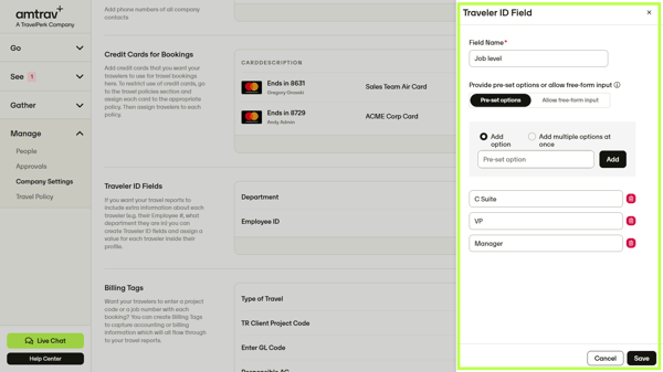 Step 2: Add the Field Name and then select whether the traveler’s answer options for each field should be chosen from a drop-down menu ("Pre-set options") or if bookers can enter their own text ("Accept free-form input"). If answers are pre-set, you’ll need to enter each pre-set option here too, click Add to save each pre-set option or add multiple pre-set options at once. Click Save to save your new Traveler ID.