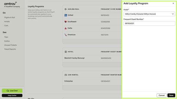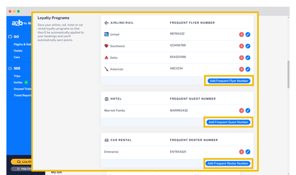 AmTrav lets you save your loyalty program information in your Profile like your frequent flyer numbers, hotel rewards and car rental account numbers so that they'll be automatically applied to your bookings and you'll automatically earn points. Here’s how to add your loyalty numbers: