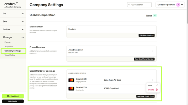 Step 1: Navigate to Company Settings in AmTrav. Scroll down to Credit Cards for Bookings and click Add New Credit Card or click the vertical ... to edit or delete a card: