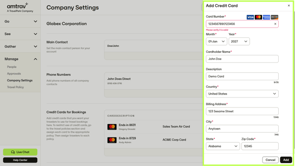Save your company's credit card information to your AmTrav account so your travelers and bookers can quickly, easily book travel