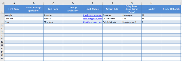 Step 1: download and fill in AmTrav's user upload template. The basic version is here, if you need additional fields please contact your Go-Live Manager or Relationship Manager (or rm@amtrav.com). Mandatory fields are first name, last name and AmTrav Role (Traveler, Coordinator, Administrator), if no policy group is specified then the default policy will be applied.