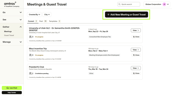 Step 1: Navigate to the Gather homepage (Meetings or Guest Travel) and click + Add New Meeting or Guest Travel: