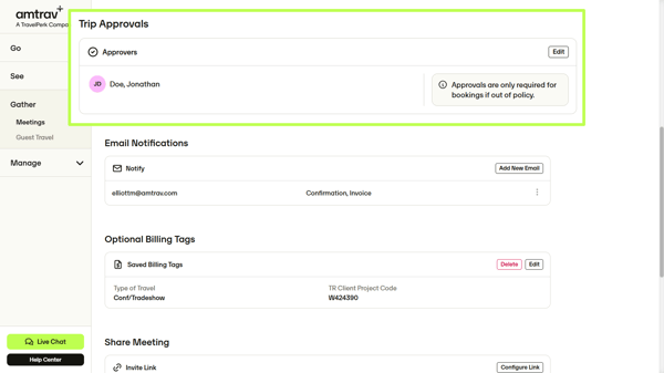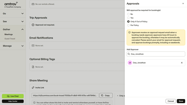 - Note that the Approvals set in Gather override the approval rules in travel policies selected for Gather invitees. For example if you select "No" approval required but specify a policy with strict approval requirements for an invited traveler, no approval will be required on that traveler's booking because "No" approval was specified. Likewise if "Yes" approval is required but specify a policy with no approval required for an invited traveler, approval will be required on that traveler's booking because "Yes" approval was specified.