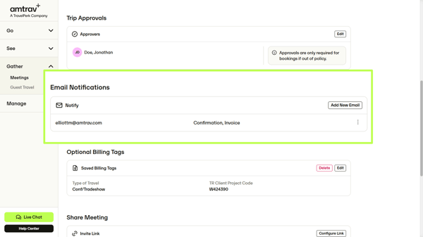 Step 5: Want others on your team to know about these bookings or invoices? Add Email Notifications, click Add New Email then provide the recipient's email, specify if they should receive the booking confirmation, invoice or both. (The traveler will automatically receive their own email confirmation.) Once you've entered each recipient click Save to add that recipient.