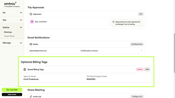 Billing Tags (more info about billing fields) are a great way to add labels or identifiers to your bookings so you can see those identifiers later in your Travel Reports. When you set the Billing Tags for your travelers here, they don't need to enter them themselves when they book.