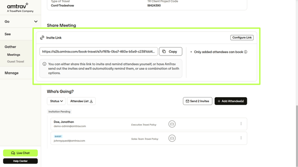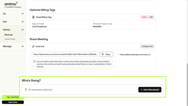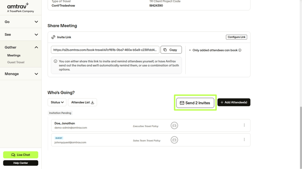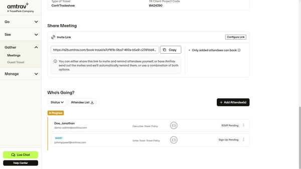 That's it! Up next, your attendees will receive the invitation emails you configured and can access AmTrav Gather to book. Again in the Who's Going section of your Meeting page you can see whether your attendees have RSVPed and booked, add additional attendees and resend invitations as you need to.