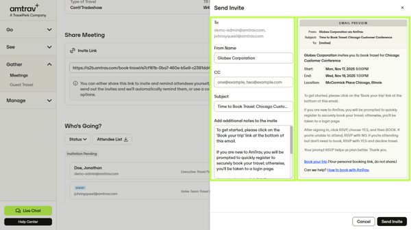 You can see a preview of your email on the right, including the meeting name, the start and end dates and times, the meeting location that you set in Step 2 above, and the Book your trip link that your invitee will use to access AmTrav and book through Gather.
