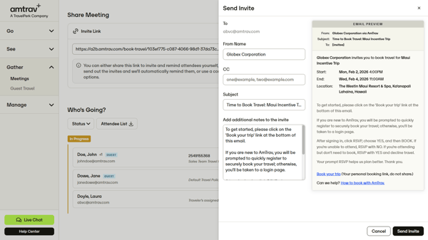 If the traveler has already RSVPed, Resend Invite is grayed out and you will not be able to resend the invite. Instead the invitee should log into AmTrav using the email address that was invited and book.